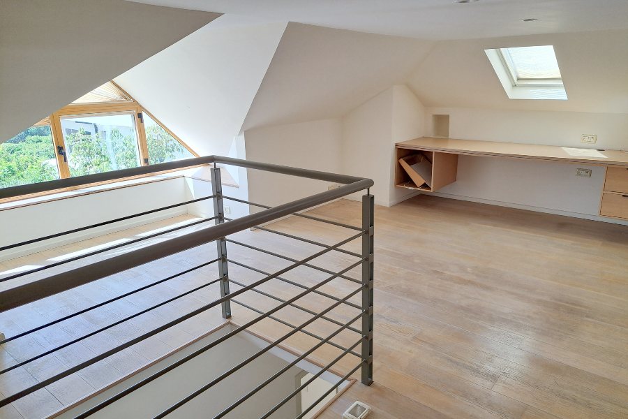 הקומה השנייה היא קומת עליית גג משופצת כחדר עבודה.