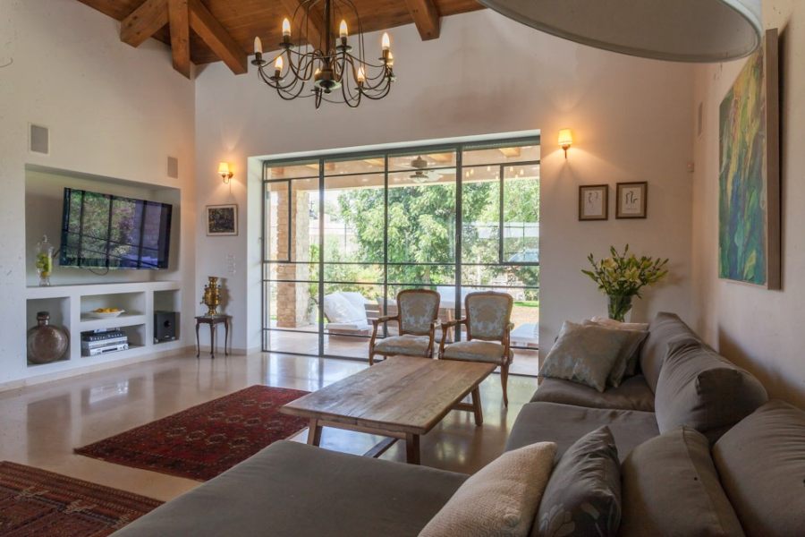 חלל אירוח גדול ומרשים , תקרות גבוהות, יציאה לאיזור אירוח מפנק בגינה .